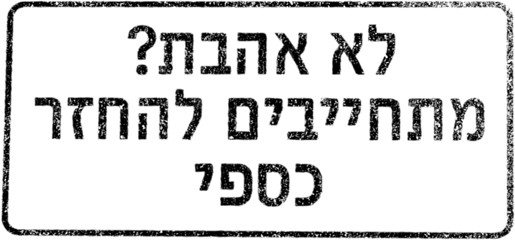 אנחנו מאמינים במוצר שלנו בלב שלם ועומדים מאחוריו. יחד עם זאת, אם אינכם מרוצים לחלוטין, תוכלו לבקש החזר כספי תוך מספר ימים ממועד קבלת המשלוח.